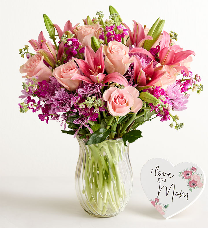 She’ll be tickled pink—and lavender and fuchsia—by this glorious Mother’s Day bouquet. Pink roses and lilies are accented with lavender and fuchsia/red blooms to make a truly spectacular and memorable statement.