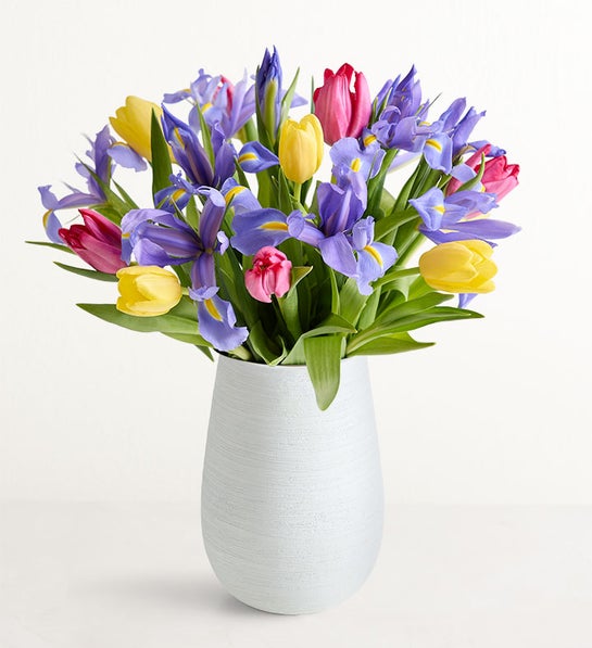 A mother’s love is infinite, just like the beauty of this lush bouquet. Pink and yellow tulips are paired with rich blue irises to create a breathtaking tribute to Mom, and to Mother Nature.
